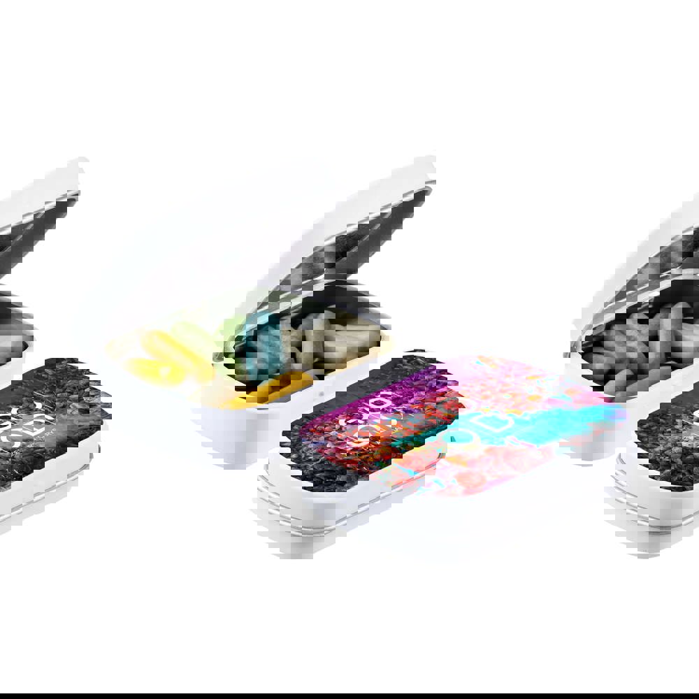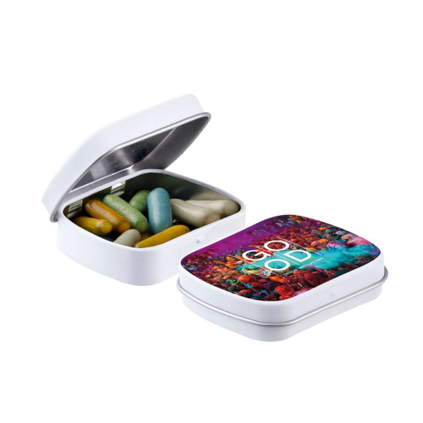 Mini matt weiße Klappdeckeldose mit ca. 23 Gramm Lakritzstangen mix, vollfarbig bedruckt. Inklusive Inhaltsstoffaufkleber und eingeschweißt.