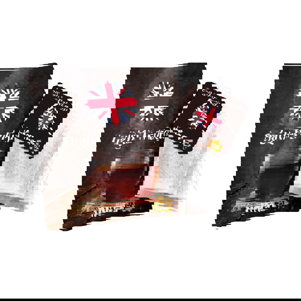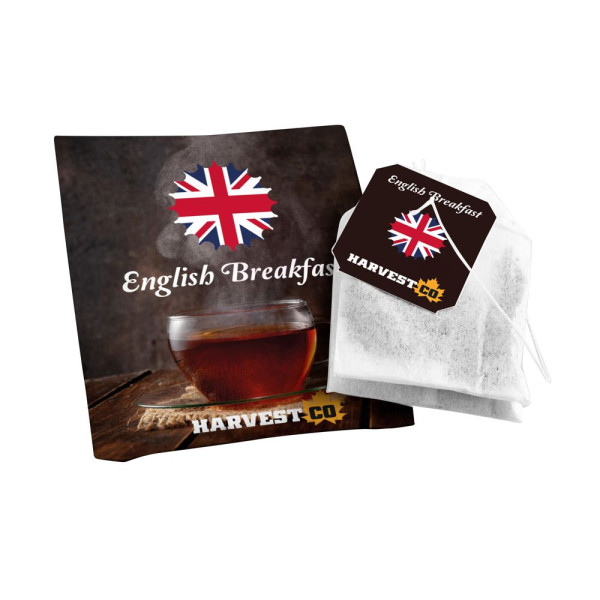 Teebeutel mit eigenem Etikett. Vollflächig farbig bedruckter Umschlag und Tee-Etikett, ca. 1,5 Gramm English Breakfast Tee