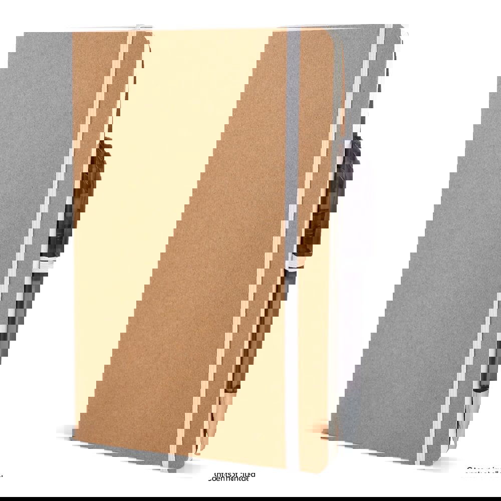 A5-Notizbuch mit weichem Kraftpapiereinband, abgerundeten Ecken, farbigem Gummiverschluss und Stiftschlaufe. Es hat 60 linierte cremefarbene Blätter aus FSC-zertifiziertem Papier. Eine praktische und natürlich wirkende Option für tägliche Notizen.