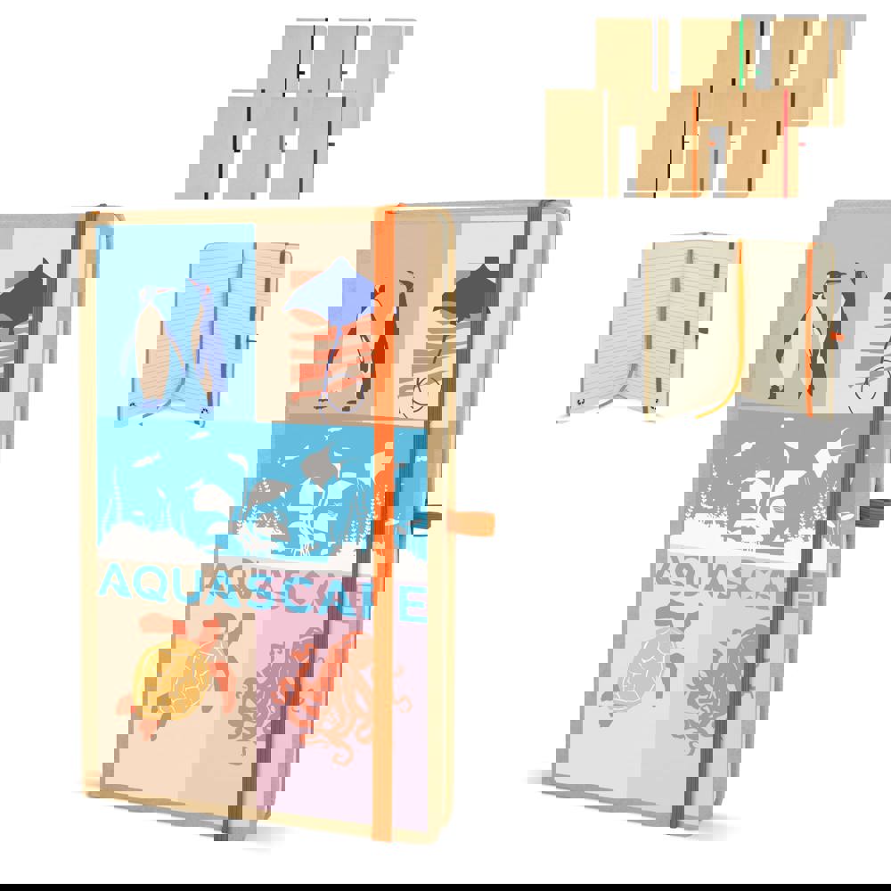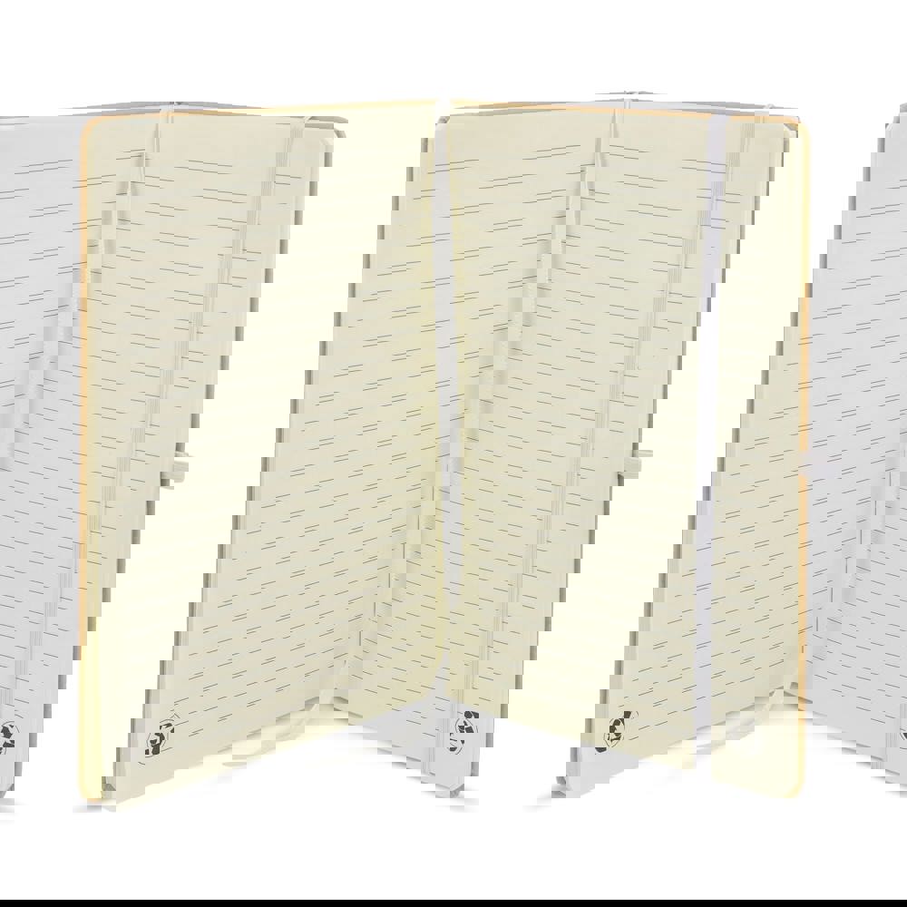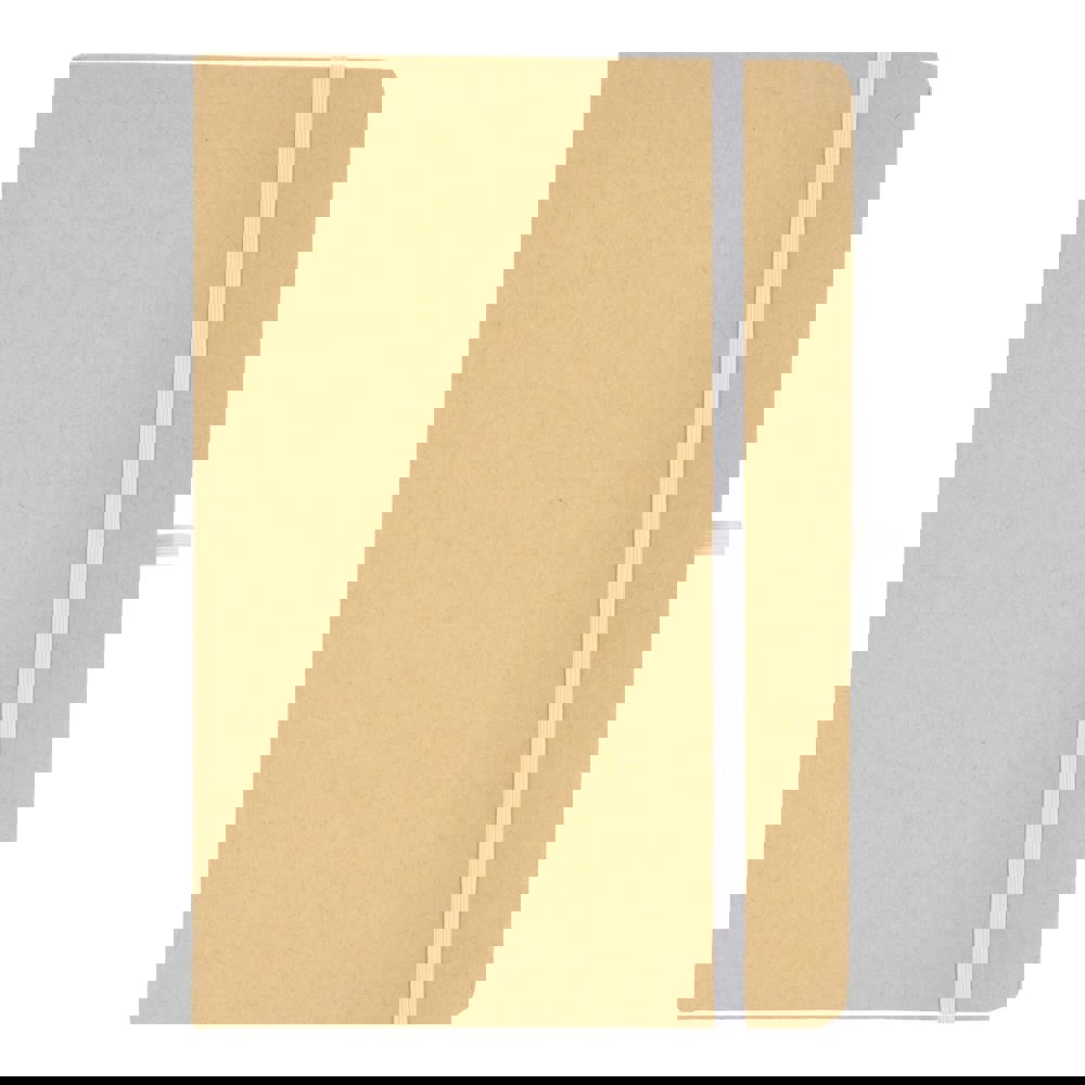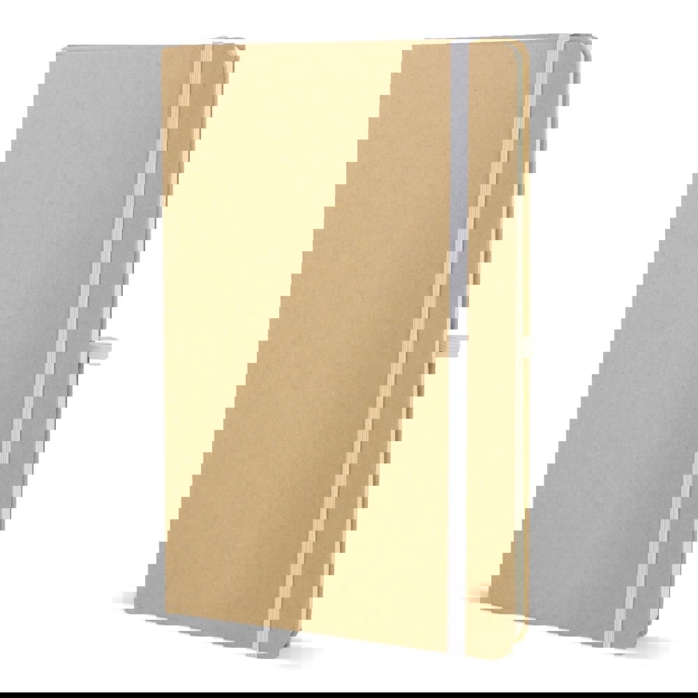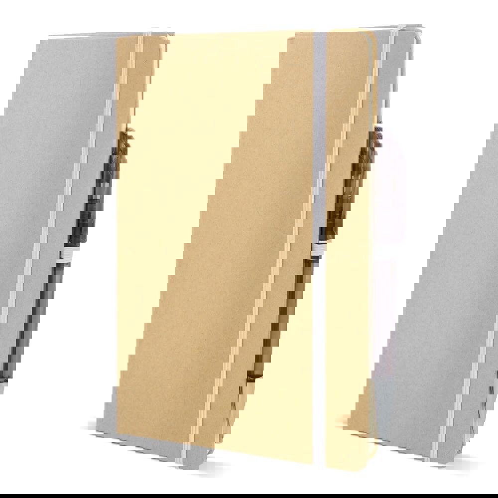 A5-Notizbuch mit Kartoneinband, abgerundeten Ecken, farbigem Gummiverschluss, Lesebändchen und Stiftschlaufe. Enthält 80 linierte cremefarbene Blätter aus Recyclingpapier. Eine praktische, umweltbewusste Wahl für den täglichen Gebrauch.