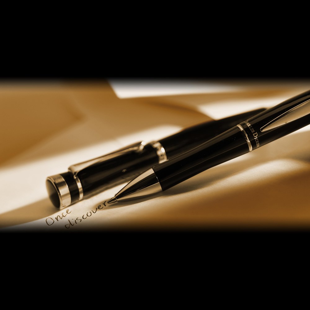 Charles Dickens Kugelschreiber, mit schwarzer Mine und Geschenk-Etui mit Metallplakette. mehr
