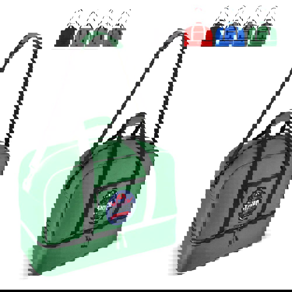 Reise- oder Sporttasche mit zwei Fächern aus recyceltem 600D-Polyester. Mit Griffen, abnehmbarer Schultergurt, Frontfach mit Reißverschluss und stabiler Bodenplatte. Die zwei Fächer trennen nasse/verschmutzte Kleidung oder Handtücher nach dem Training bzw. Schuhe von der Kleidung auf Reisen.