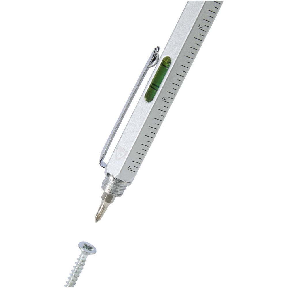 Der Dora Multifunktionskugelschreiber aus Aluminium besteht teilweise aus recyceltem Material und ist mit einem doppelseitigen Lineal, einer Wasserwaage, einem Schraubendreher, einem Neigungsmesser und einem schwarzen Stylus aus Gummi ausgestattet. Der Schaft besteht aus recyceltem Aluminium mit einer silbernen Sprühbeschichtung. Der Clip besteht aus Eisen. Der Schraubenzieher ist aus Stahl. Der obere Teil und die Spitze sind aus RABS gefertigt. Tintenfarbe: Schwarz. Schreiblänge: 400 Meter. Strichstärke: 1,0 mm.