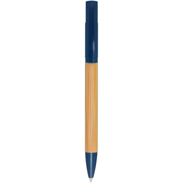 Bamboo-Kugelschreiber, der auch als Telefonhalterung fungiert. Der Knopf und der Mittelring bestehen aus recyceltem Kunststoff, die Spitze aus Messing und der Schaft aus nachhaltig angebautem Bambus. Tintenfarbe: Schwarz. Schreiblänge: 1000 Meter. Strichstärke: 1,0 mm.