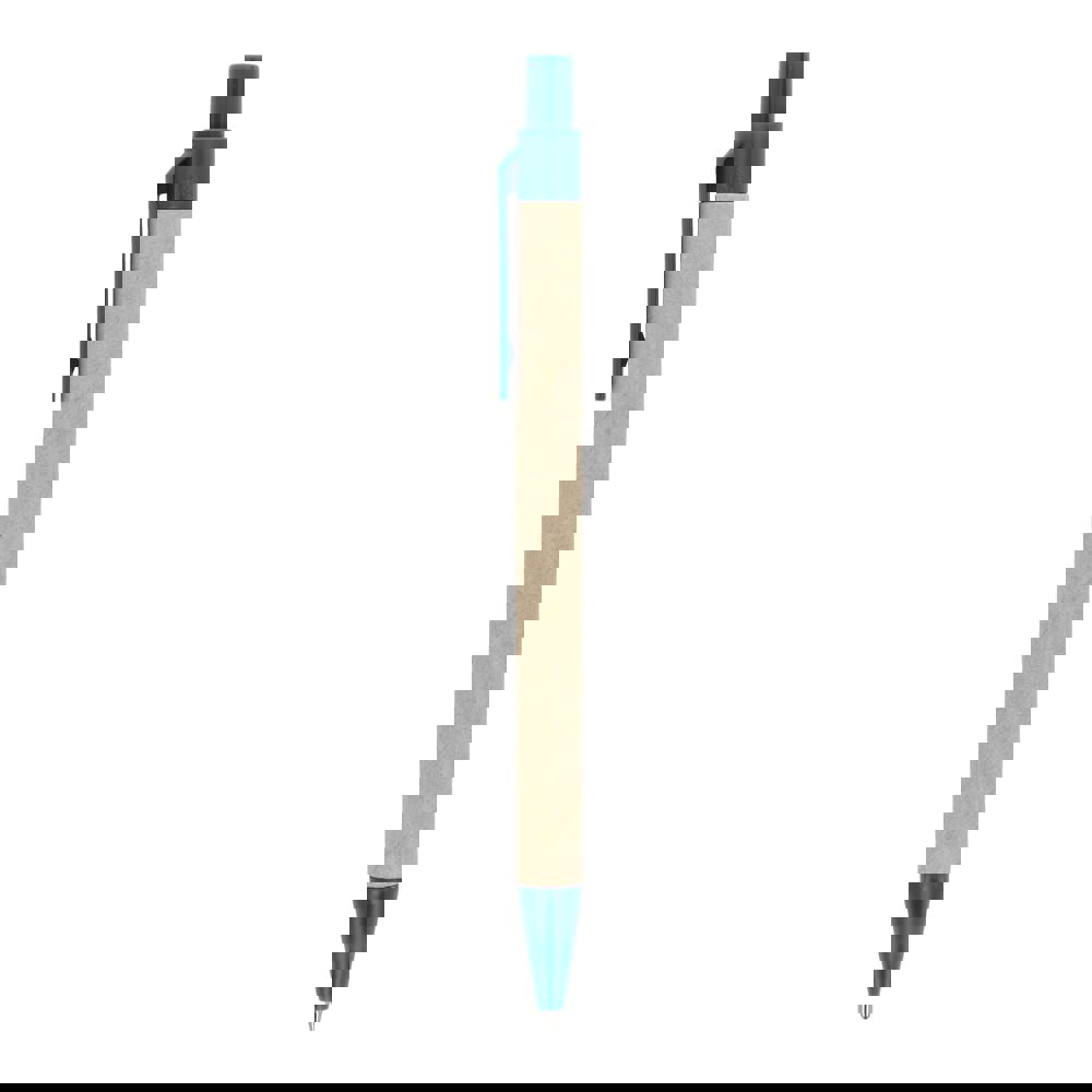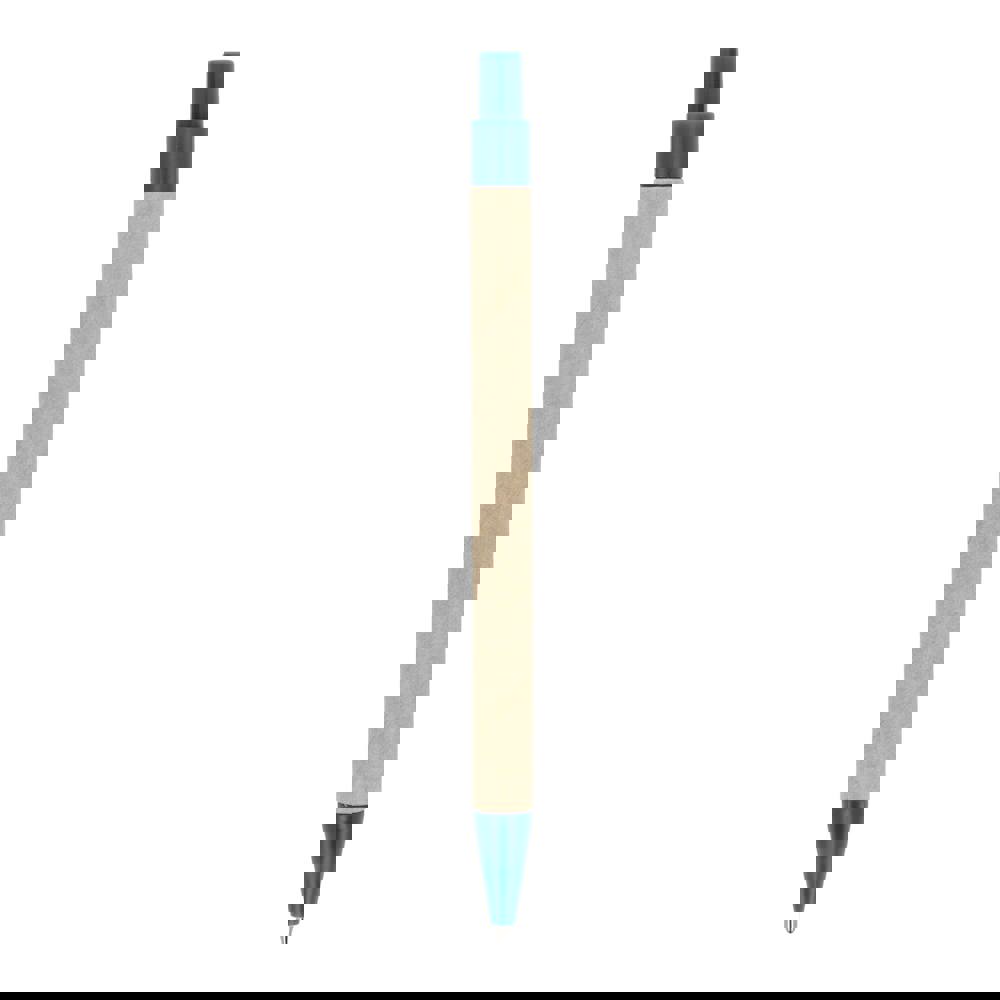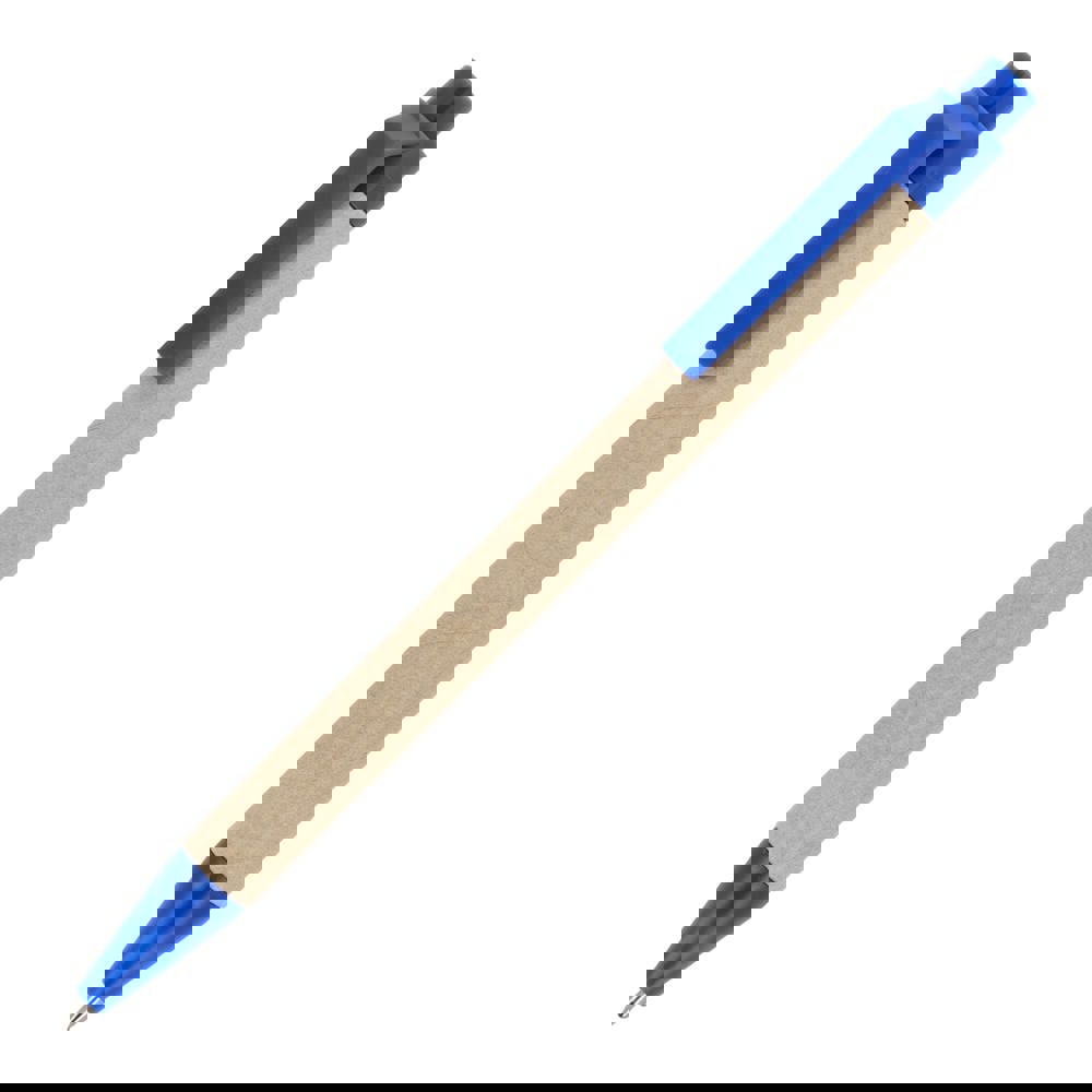 Papierkugelschreiber mit farbigen Kunststoffteilen aus recyceltem Material. Mit blauer Schreibmine.