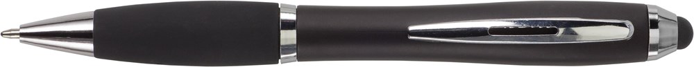 Kugelschreiber aus Kunststoff, mit Drehfunktion, Metall-Clip, gummierter Griffzone, Touchpen und schwarzer Mine.