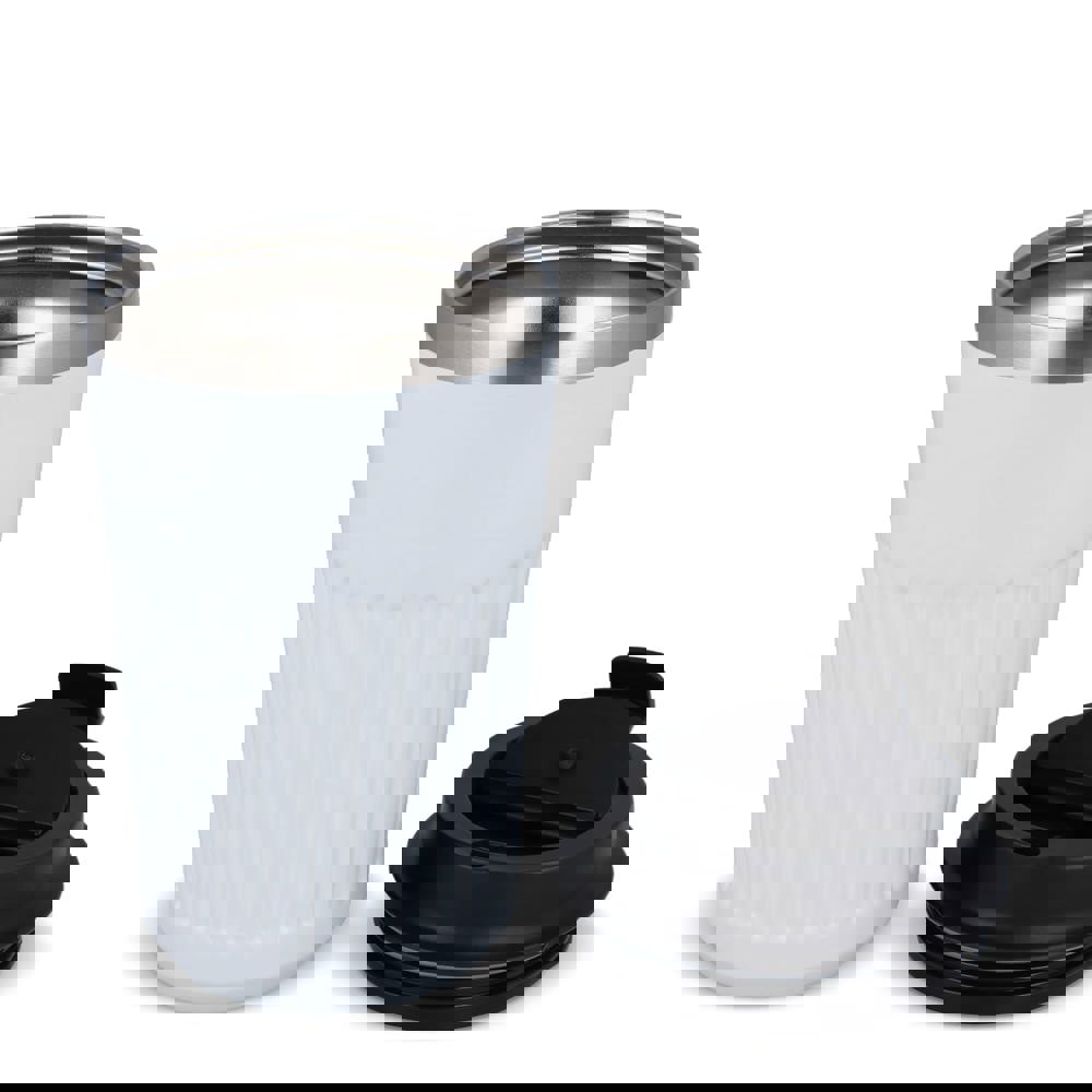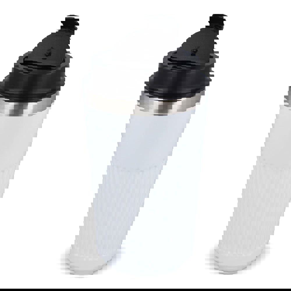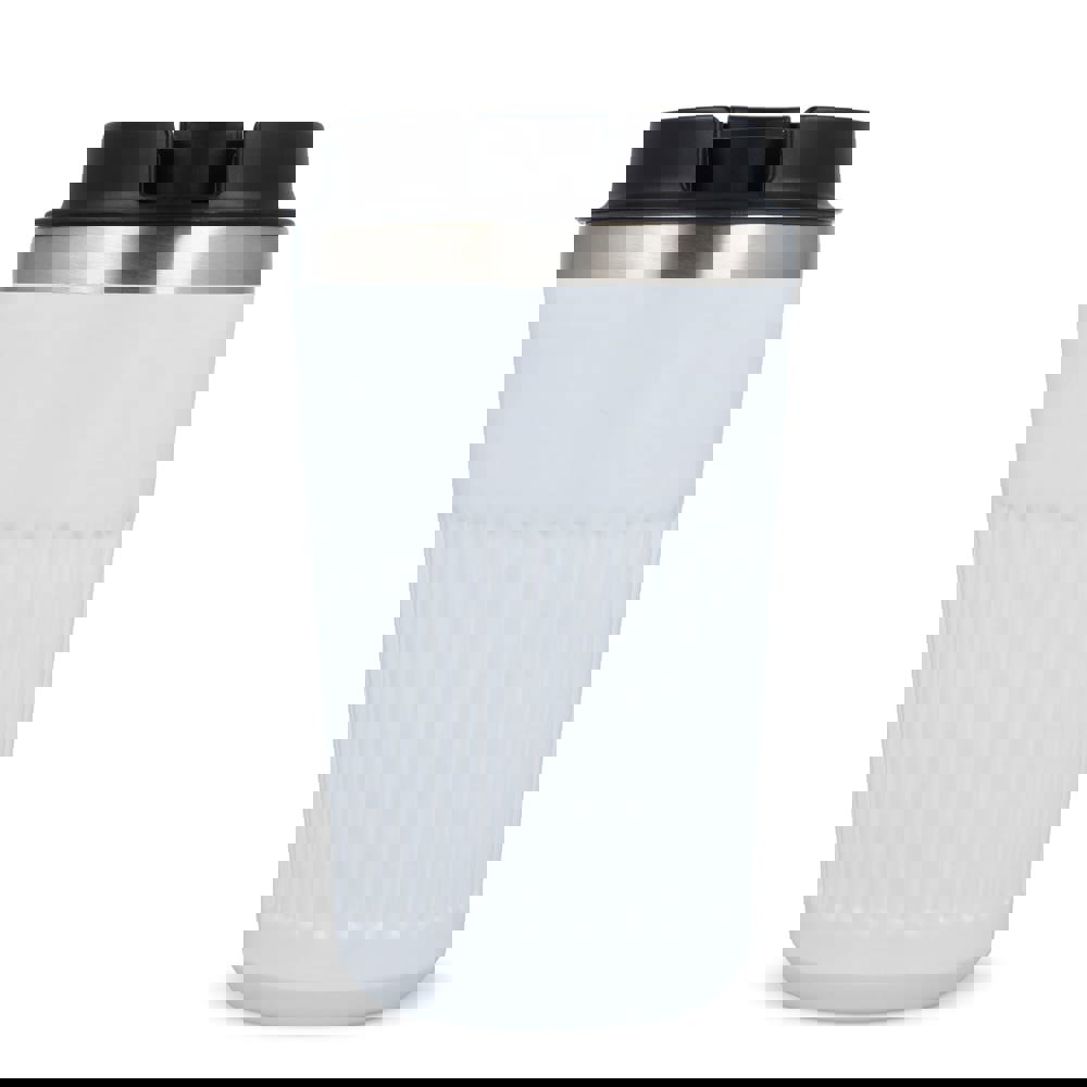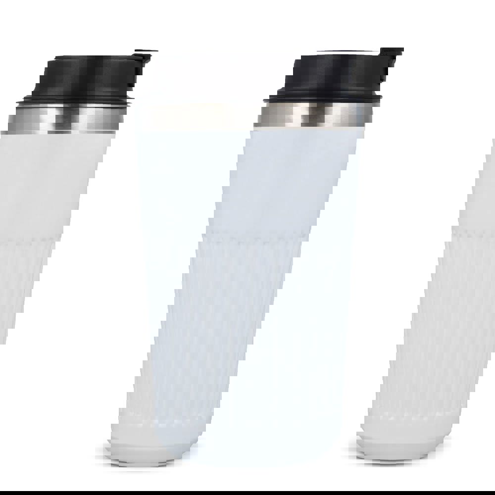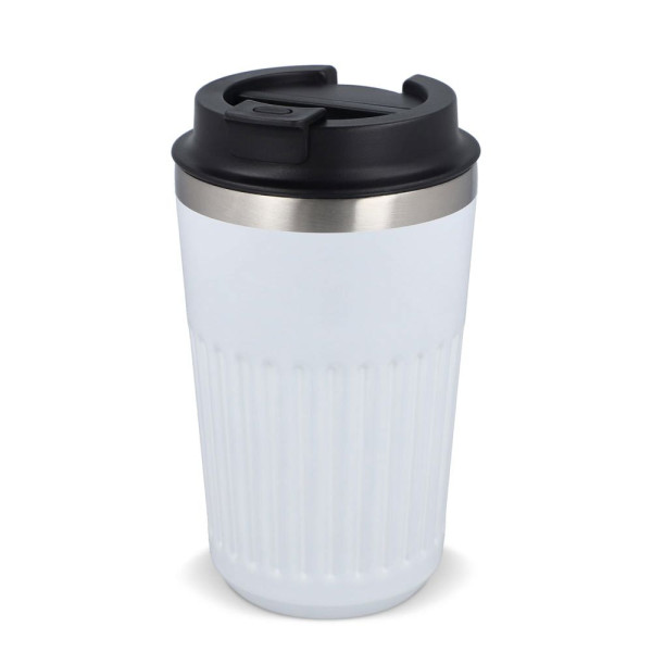 Recycelter Edelstahl-Thermobecher für Kaffee zum Mitnehmen, 400 ml, mit auslaufsicherem Deckel. Der Becher hat ein modernes Streifenmuster, in einer Geschenkbox verpackt.