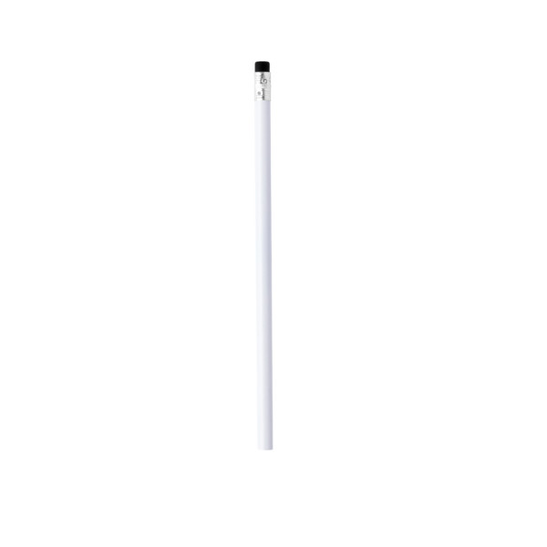 Holzstift in Weiß mit glänzender Oberfläche. Mit rundem Griff und Radiergummi, erhältlich in verschiedenen Farben. Schwarze Mine und ungespitzte Spitze.