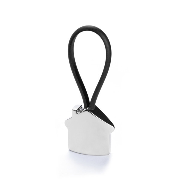 Metall-Schlüsselanhänger mit elegantem Haus-Design in 3D. Mit Gummiband in verschiedenen lebendigen Farben für die Befestigung der Schlüssel.
