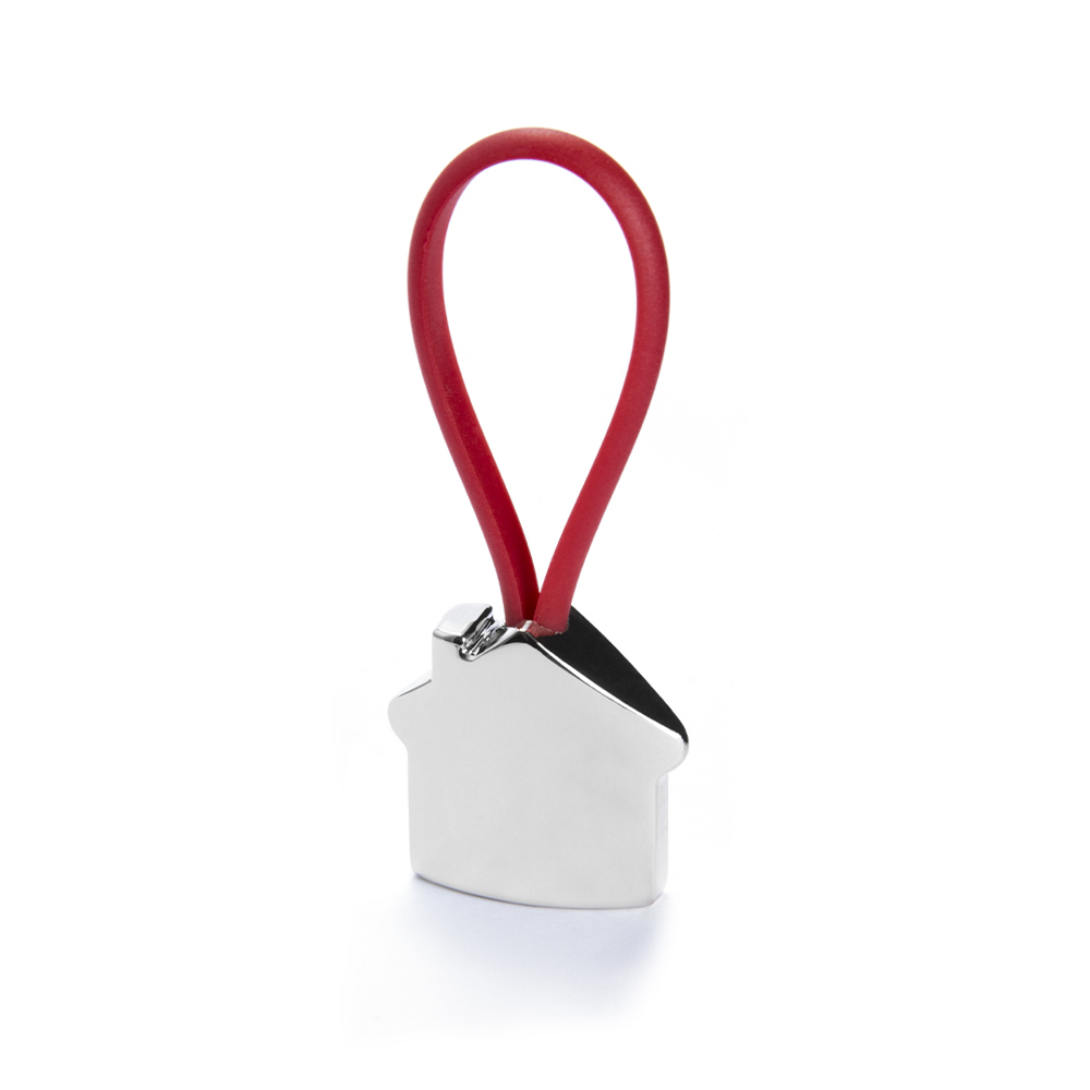 Metall-Schlüsselanhänger mit elegantem Haus-Design in 3D. Mit Gummiband in verschiedenen lebendigen Farben für die Befestigung der Schlüssel.