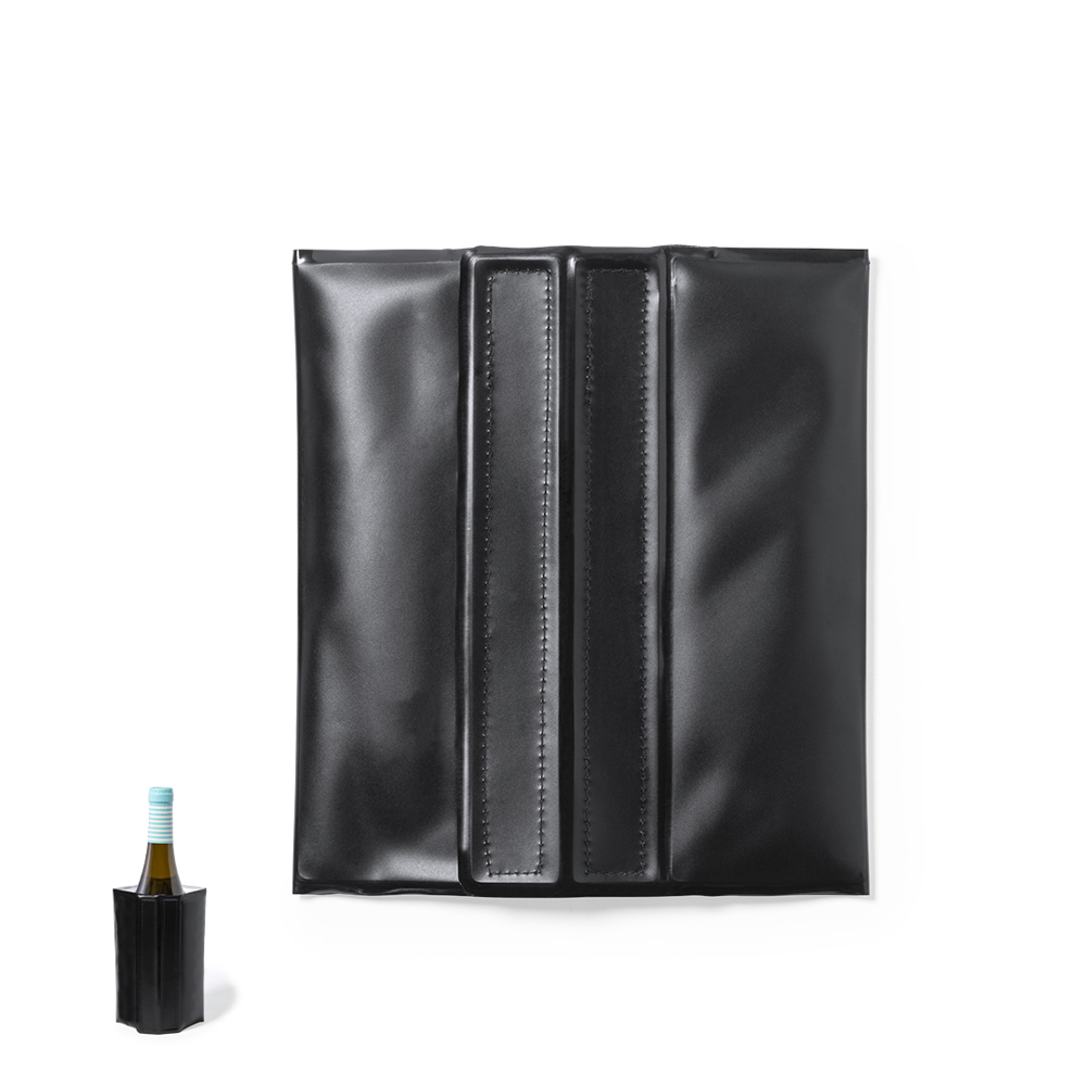 Kühler mit verstellbarem Klettverschluss, innen mit flüssigem Kühlmittel und aus mattschwarzem PVC.