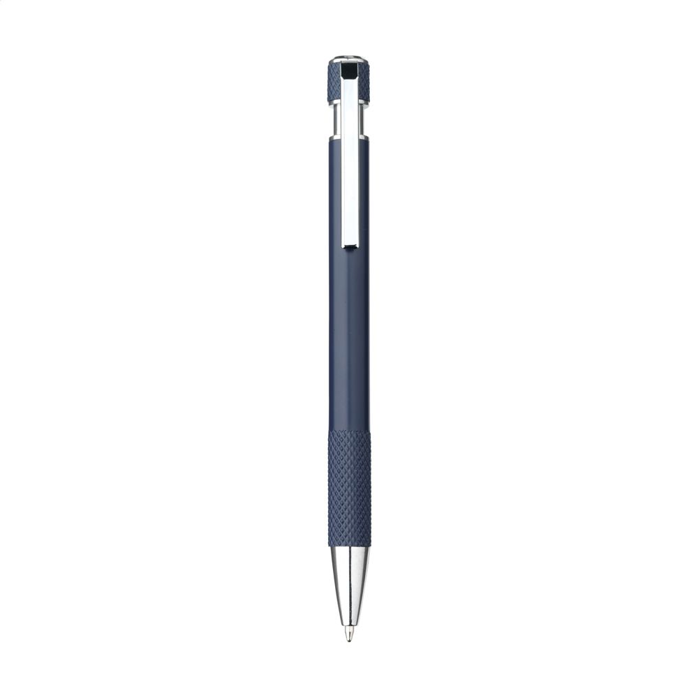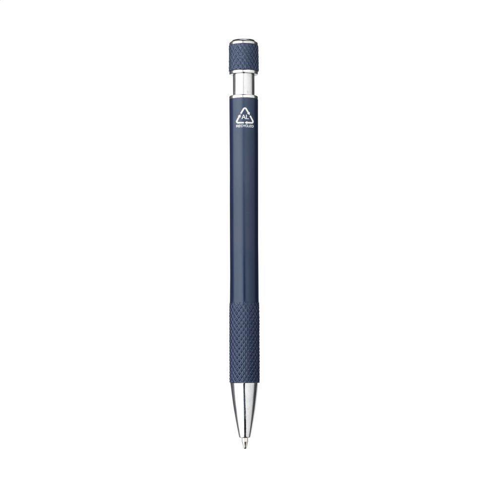 Kugelschreiber mit blauer Tinte und einem Gehäuse aus 100% recyceltem Aluminium. Mit rutschfestem Griff mit dezenten Prägungen, die sich stilvoll auf dem Druckknopf wiederholen. Mit silberfarbenen Hochglanzakzenten und Metallclip. RCS-zertifiziert. Durch die Verwendung von recyceltem Aluminium werden bei der Herstellung dieses Produkts weniger neue Rohstoffe verwendet. Das bedeutet weniger Energieverbrauch und weniger Wasserverbrauch.