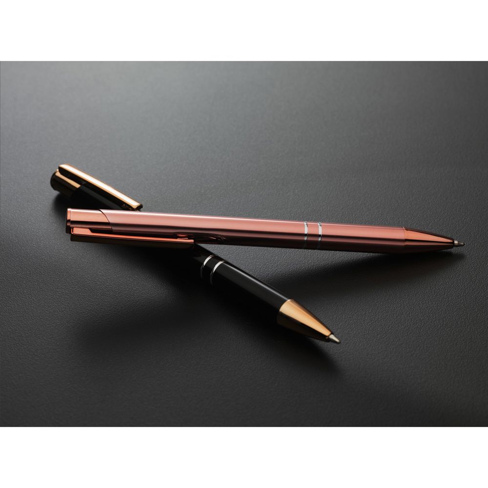 Blauschreibender Kugelschreiber aus recyceltem Aluminium mit einem stabilen, roségoldenen Clip/Druckknopf, ebenfalls aus recyceltem Aluminium. Der Kugelschreiber hat elegante roségoldene und silberne Akzente, die ihm ein auffallend schickes Aussehen verleihen. RCS-zertifiziert. Gesamtes recyceltes Material: 94%. Durch die Verwendung von recyceltem Aluminium werden bei der Herstellung dieses Produkts weniger neue Rohstoffe verwendet. Das bedeutet weniger Energieverbrauch und weniger Wasserverbrauch.