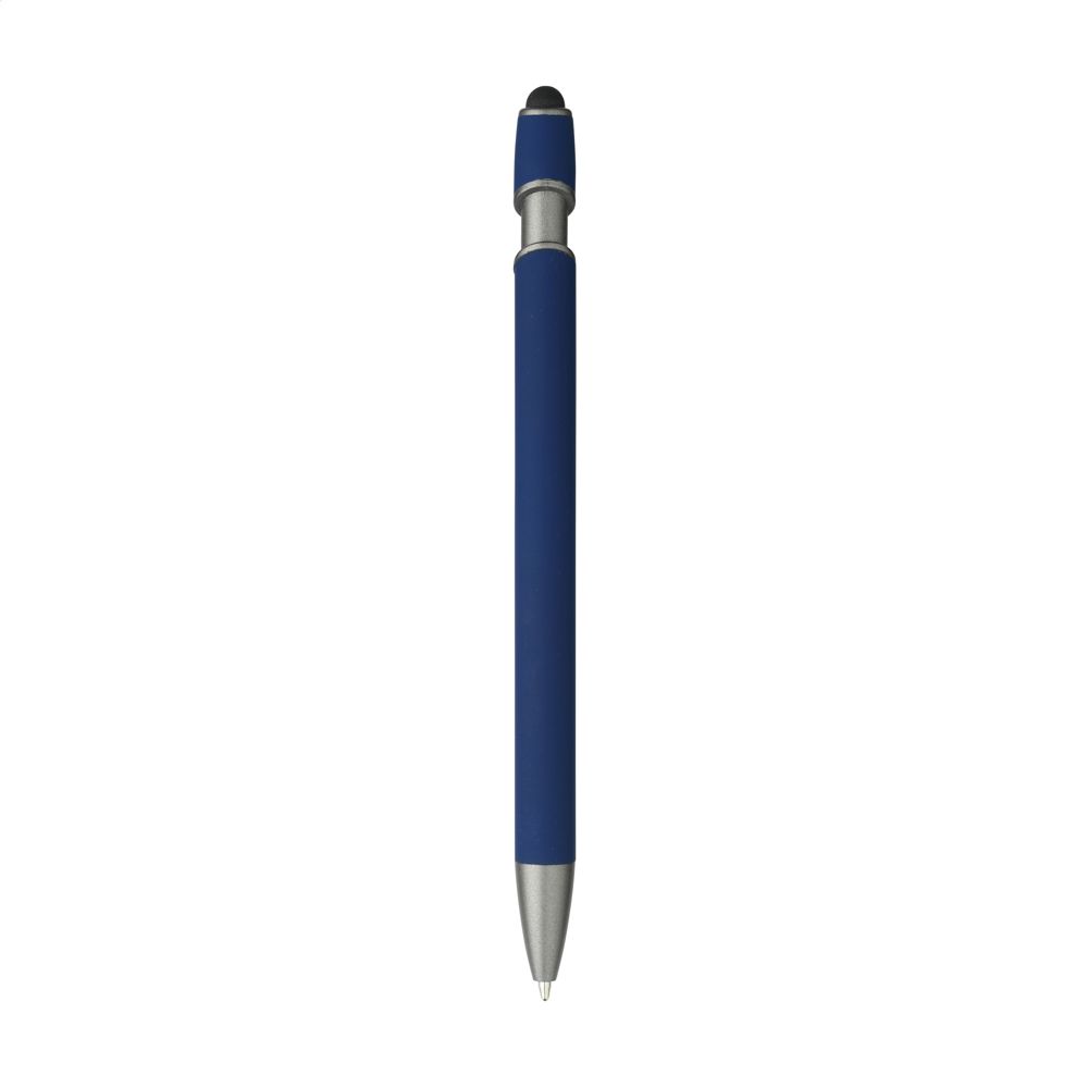 Blauschreibender Kugelschreiber mit einem Gehäuse aus recyceltem Aluminium. Das Gehäuse verfügt über eine gummierte Soft-Touch-Oberfläche und eine Gummispitze zum Bedienen von Touchscreens. Mit Metallclip. RCS-zertifiziert. Gesamtes recyceltes Material: 94%. Durch die Verwendung von recyceltem Aluminium werden bei der Herstellung dieses Produkts weniger neue Rohstoffe verwendet. Das bedeutet weniger Energieverbrauch und weniger Wasserverbrauch.