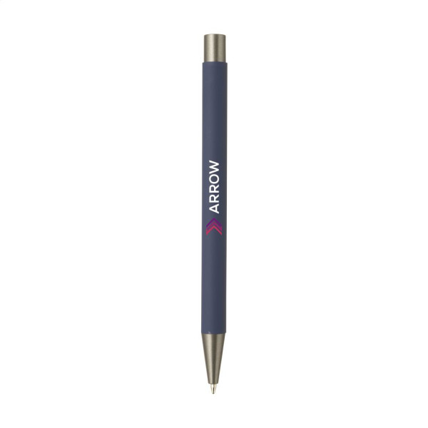 Blauschreibender Kugelschreiber mit einem Gehäuse aus 100 % GRS-zertifiziertem recyceltem Aluminium. Das Gehäuse ist mit einer gummierten Soft-Touch-Oberfläche versehen. Das schlichte Design ohne Clip verleiht dem Stift ein modernes, elegantes Aussehen. RCS-zertifiziert. Gesamtes recyceltes Material: 81%. Durch die Verwendung von recyceltem Aluminium werden bei der Herstellung dieses Produkts weniger neue Rohstoffe verwendet. Das bedeutet weniger Energieverbrauch und weniger Wasserverbrauch.