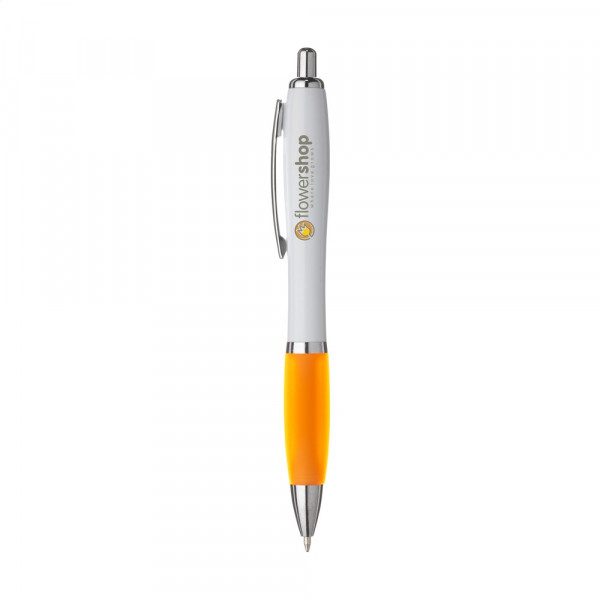 Blauschreibender oder schwarzschreibender Kugelschreiber mit weißem Gehäuse, farbigem, grifffestem Vorderstück und Metallclip.