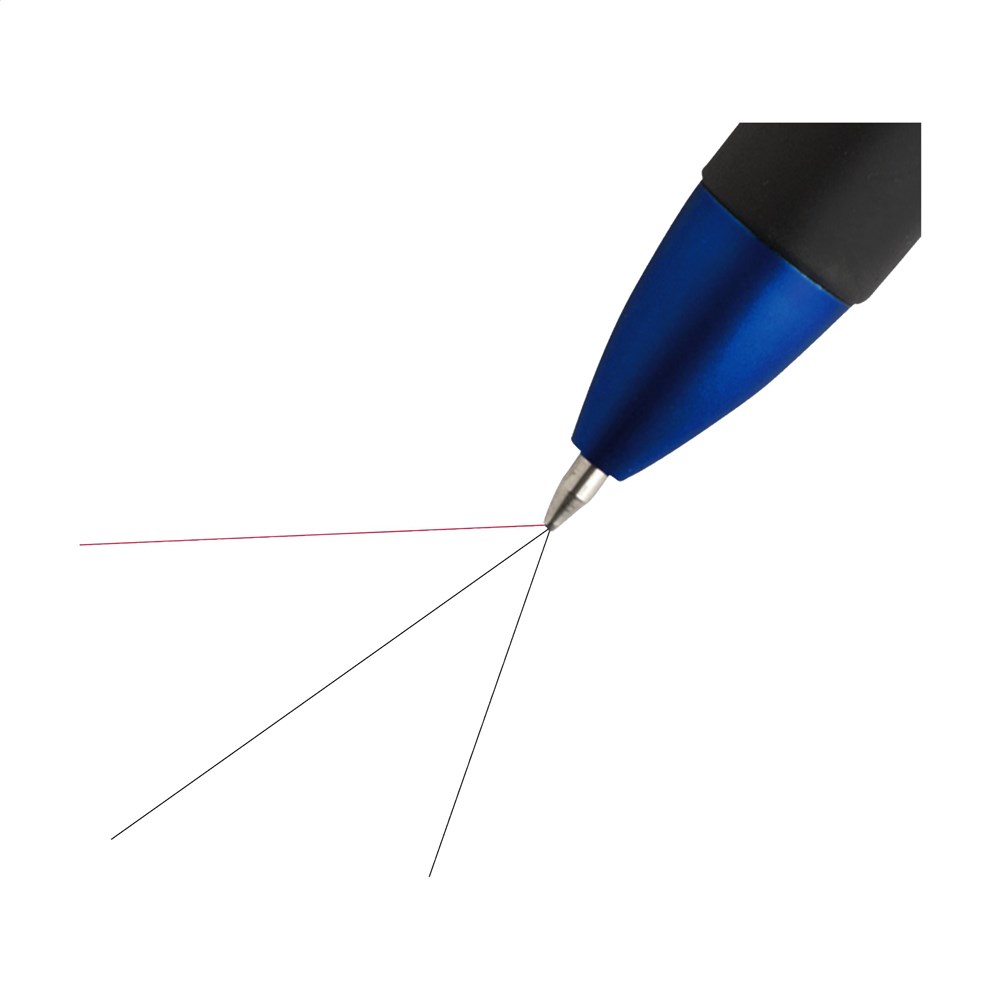 3-farbiger Kugelschreiber mit Gummispitze zum Bedienen von Touchscreens (wie iPhone/iPad), Gehäuse in Metalloptik, silberne Akzente und Gummivorderteil. Mit blauer, roter und schwarzer Tinte.