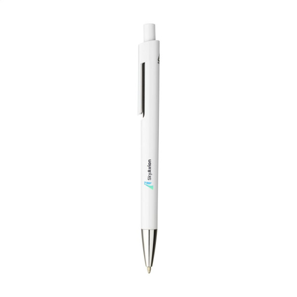 Blauschreibender Kugelschreiber mit einem Gehäuse aus recyceltem ABS. Mit einzigartigem Design: das Gehäuse und der Clip von diesem Kugelschreiber sind aus 'einem Guss', was diesen Kugelschreiber zu einem besonderen Blickfang macht. Mit auffallendem Farbakzent unter dem GRS-zertifiziert.