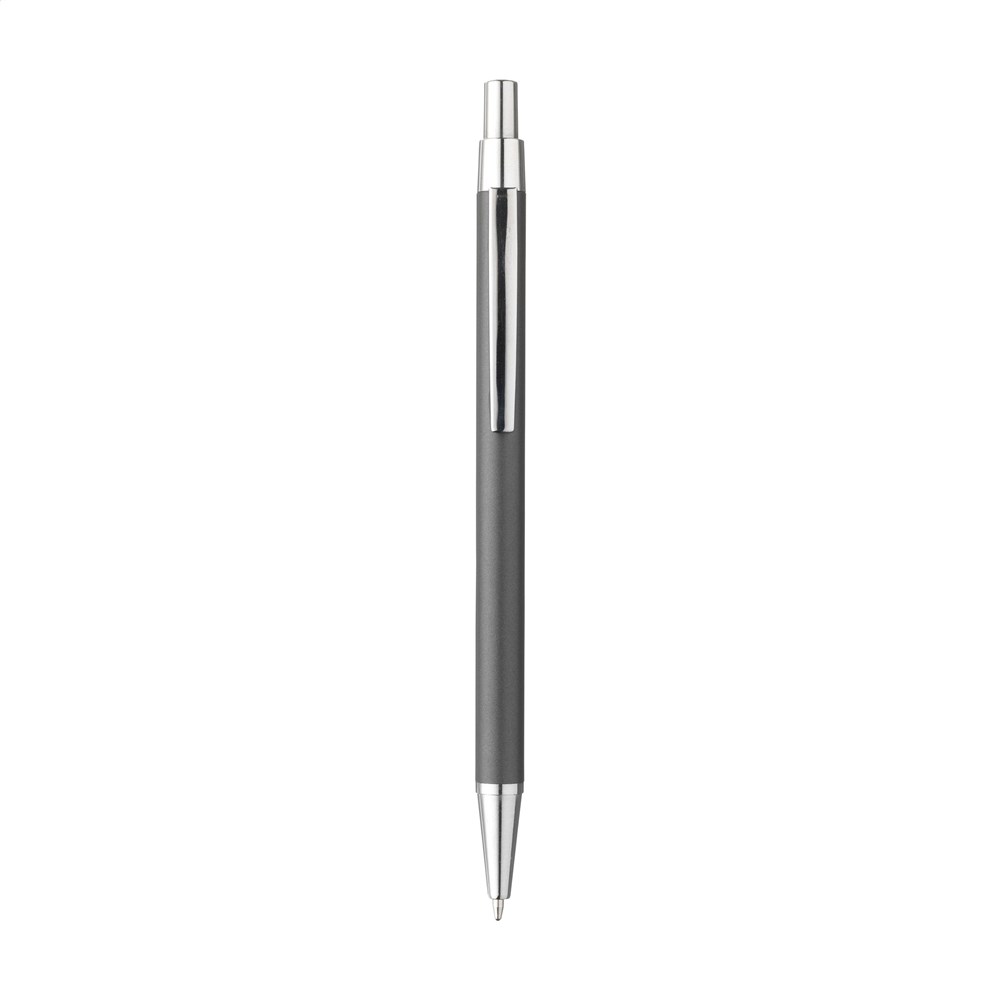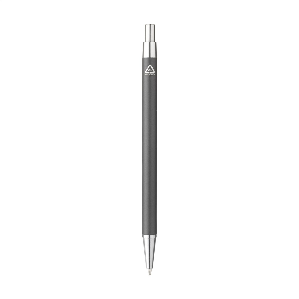 Blauschreibender Kugelschreiber mit schlankem Halter aus Aluminiumschrott. Der Halter dieses Kugelschreibers besteht zu 85% aus zertifiziertem, recyceltem Aluminium. Mit stabilem Metallclip und Druckknopf. Durch die Verwendung von recyceltem Aluminium werden bei der Herstellung dieses Produkts weniger neue Rohstoffe verwendet. Das bedeutet weniger Energieverbrauch und weniger Wasserverbrauch.