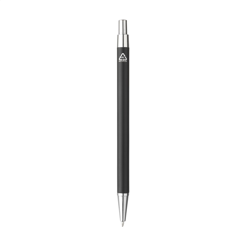 Blauschreibender Kugelschreiber mit schlankem Halter aus Aluminiumschrott. Der Halter dieses Kugelschreibers besteht zu 85% aus zertifiziertem, recyceltem Aluminium. Mit stabilem Metallclip und Druckknopf. Durch die Verwendung von recyceltem Aluminium werden bei der Herstellung dieses Produkts weniger neue Rohstoffe verwendet. Das bedeutet weniger Energieverbrauch und weniger Wasserverbrauch.