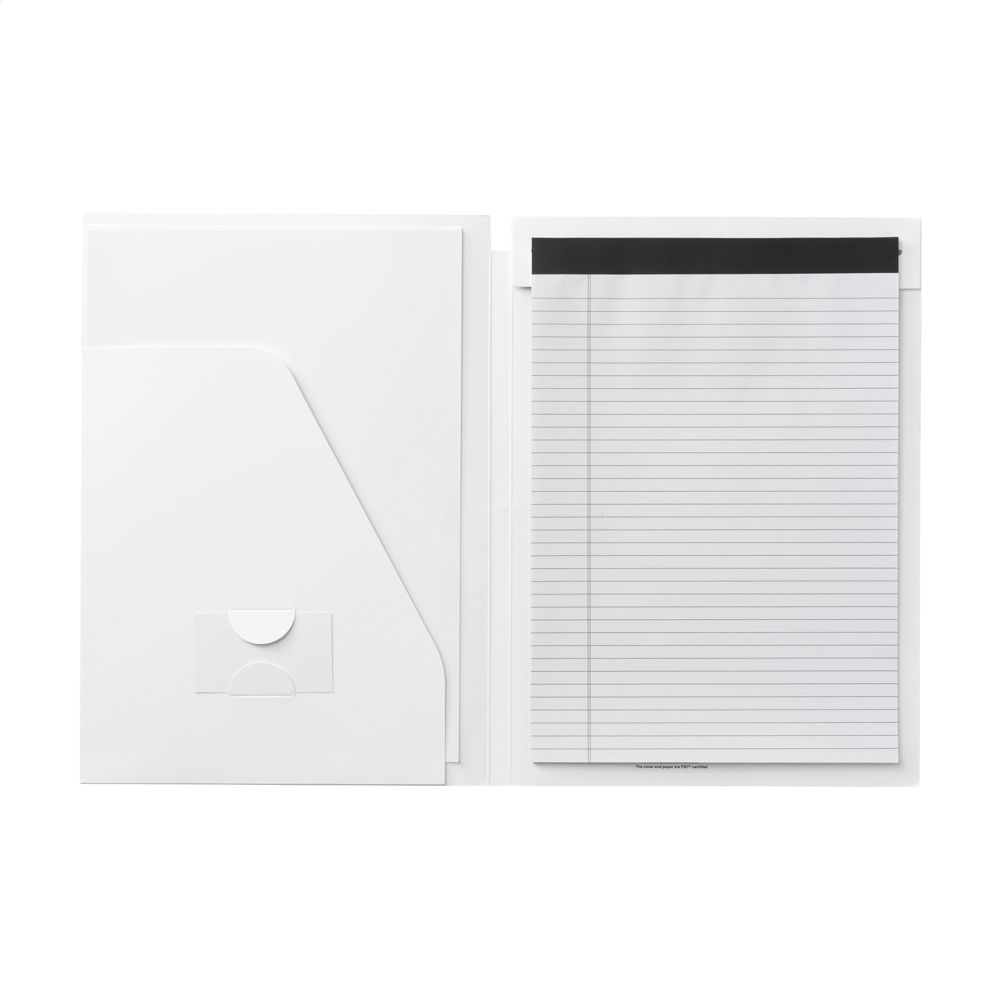 Schreibmappe/Dokumentenmappe aus stabilem, FSC 100% zertifiziertem Kraftkarton (350 g/m²). Inklusive Schreibblock mit ca. 30 Blatt liniertem, FSC 100% zertifiziertem Papier (70 g/m²). Mit praktischer Einsteckfach auf der Innenseite mit Platz für eine Visitenkarte. Geeignet für A4-Dokumente. Diese Mappe schützt Dokumente und eignet sich für geschäftliche, studienbezogene oder private Zwecke.