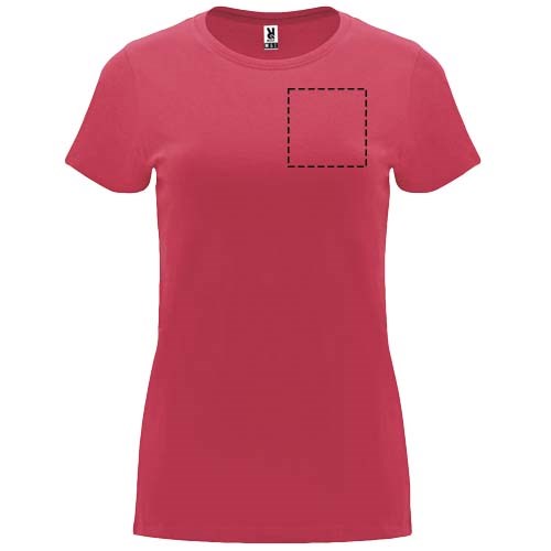 Tailliertes kurzärmeliges T-Shirt für Damen. Rundhalsausschnitt mit 1×1 Rippstrick. Verstärkte und verdeckte Nähte am Kragen. Herausnehmbares Etikett.