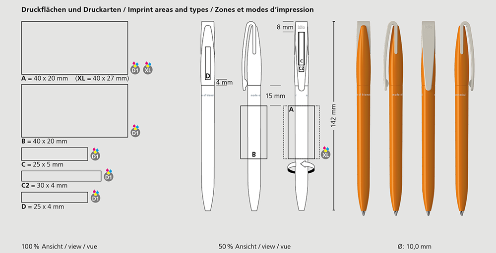 Der Cobra bio ist ein Drehkugelschreiber. Materialien und Oberflächen: Schaft, Oberteil und Klipp: biobasierter Kunststoff aus Pflanzenstärke (PLA) hochglänzend, industriell kompostierbar nach DIN EN 13432. Minenröhrchen: Recyceltes Polypropylen (rPP). Standardfarben: Schaft, Oberteil und Klipp: aus 8 Biofarben kombinierbar. Hinweis: Aufgrund der organischen Rohstoffe kann es zu Farbabweichungen auch bei einzelnen Bauteilen eines Produktes kommen. Sonderfarben: ab 5.000 Stück, ab 25.000 Stück ohne PMS-Zuschlag. Standardmine: Silktech L (3.000 m), blau oder schwarz, Mine optional: Silktech XL, Multifill P, Multi-Gel.