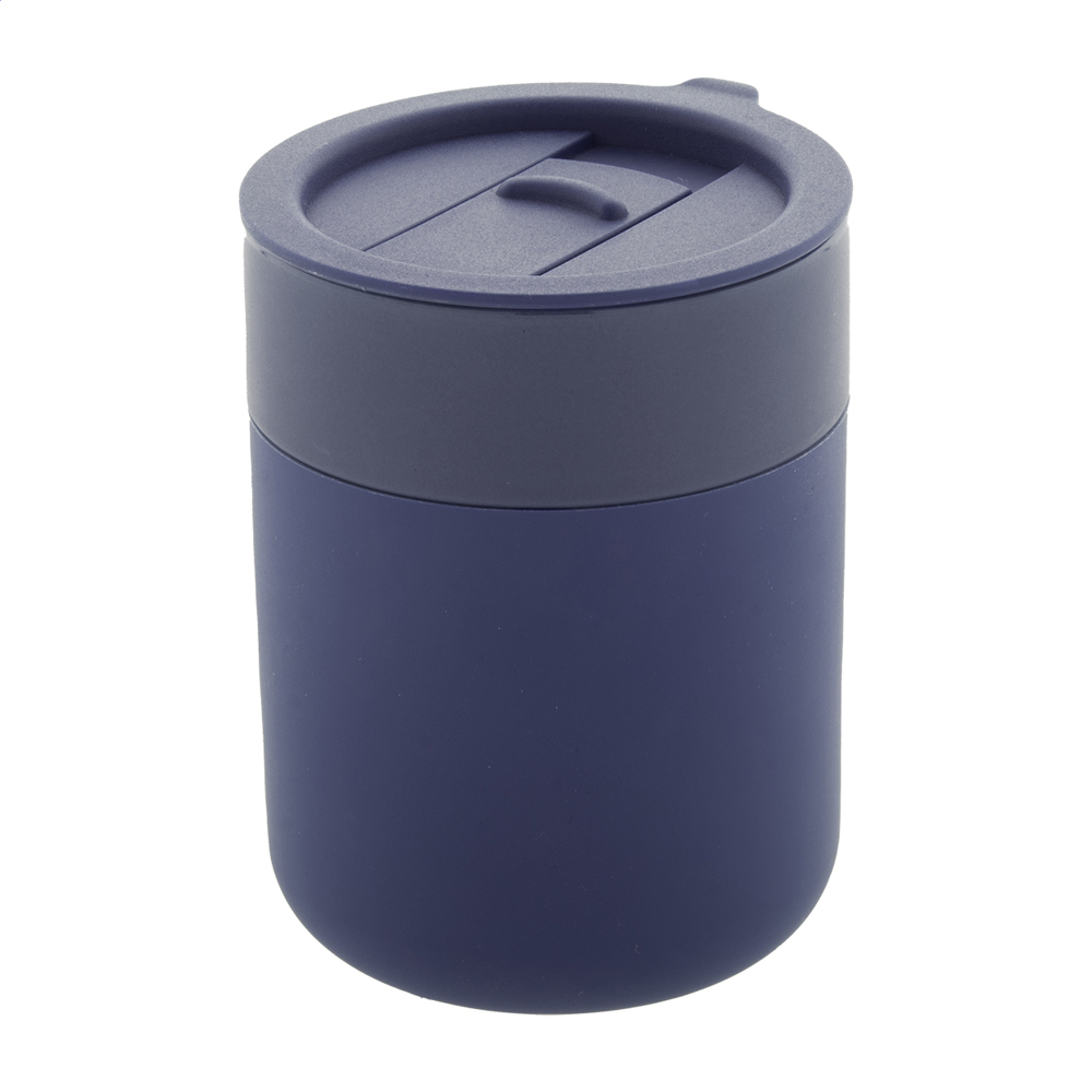 Reisebecher aus Keramik mit Silikonummantelung mit Trinkdeckel aus PP Kunststoff. Füllmenge: 300 ml.