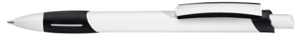 Druckkugelschreiber mit gedeckt weißem Gehäuse, transparent gefrosteter Gummigriffzone, Zierring und Clipschale.