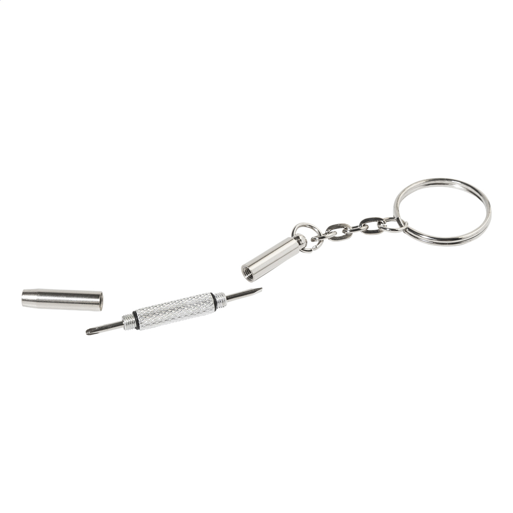 Kompaktes Brillenreparaturset in transparenter PP-Box. Enthält ein Reinigungstuch aus 100 % RPET-Mikrofaser (220 g/m²) und einen Mini-Schraubendreher mit Schlüsselring. Tuchgröße: 18x15 cm.
