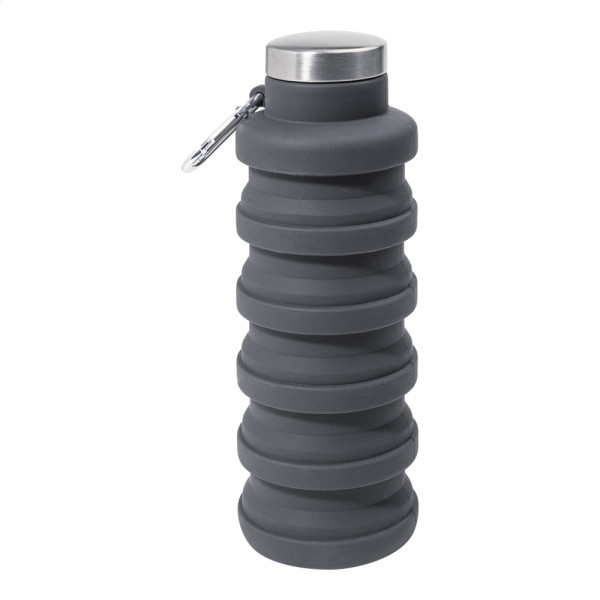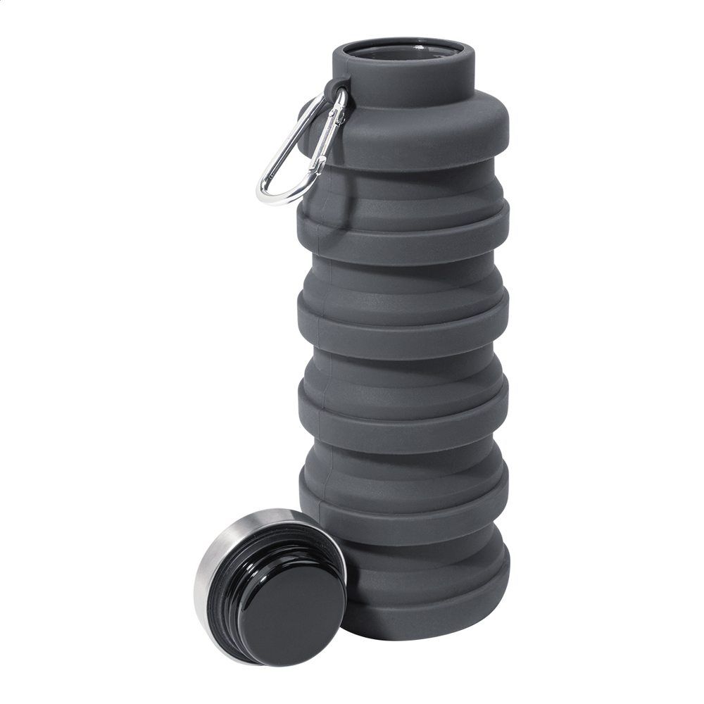 Faltbare Trinkflasche aus Silikon mit Deckel aus Edelstahl und Aluminium-Karabiner. Füllmenge: 500 ml.