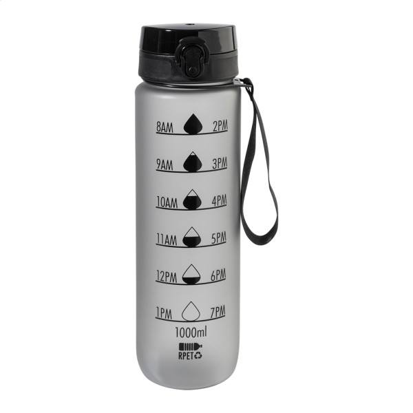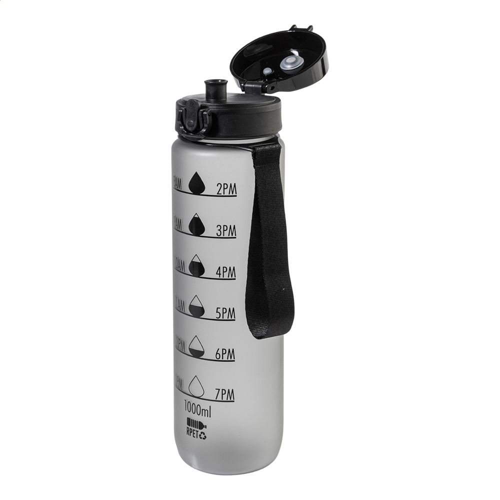 Trinkflasche aus gefrostetem RPET mit motivierender Zeitmarkierung, automatischem Flip-Top-Deckel mit Sicherheitsverschluss und Trageschlaufe. Füllmenge: 1000 ml. BPA-frei. Nicht geeignet für kohlensäurehaltige Getränke.