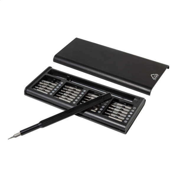 Präzisionsschraubendreher-Set mit 24 Bits im recycelten ABS-Koffer. Der Griff verfügt über eine magnetische Bitaufnahme für schnellen und sicheren Bitwechsel.