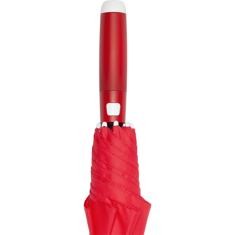 Stylischer Automatik-Stockschirm in mittlerer Größe mit weißem Stock, Schienen und Kunststoff-Spitzen Komfortable Automatik-Funktion zum schnellen Öffnen, hochwertiges Windproof-PLUS-System für eine maximale Gestell-Flexibilität bei stärkeren Windböen, flexible Fiberglasschienen in weiß, stabiler Stahlstock mit weißer Kunststoffummantelung, Polyester-Pongee Bezugsmaterial aus recycelten Kunststoffen, weiße Kunststoff-Spitzen, formschöner Soft-Feel-Griff mit integrierter Auslösetaste und Werbeanbringungsmöglichkeit