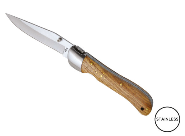 Klappbares Messer mit Klinge aus rostfreiem 420er Edelstahl. Griff aus Zebranoholz. Verzierte Feder. Geschmiedete Heftbacken aus Edelstahl. Einhändiges Öffnen/ Schließen mit einem Liner-Lock-Sicherheitsmechanismus. Wird mit einem melierten grauen Etui geliefert.
