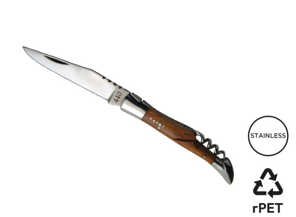 Klappbares Messer, das gemäß sehr strengen Spezifikationen hergestellt wurde: Klinge aus rostfreiem 440er Edelstahl, auch als 'chirurgischer Stahl' bezeichnet. Er bietet eine perfekte Kombination aus Chrom (das vor Rost schützt) und Kohlenstoff (der für Schärfe sorgt). Rasiermesserscharfe Klinge. Griff aus Olivenholz. Korkenzieher aus rostfreiem Edelstahl. Zwei geschmiedete Heftbacken aus rostfreiem Edelstahl. Verzierte Feder. Dieses Modell ist zudem mit einem Motiv des Hirtenkreuzes verziert. Wird in einem grauen Etui aus RPET geliefert.
