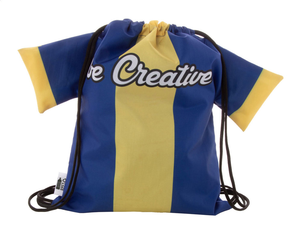 Individuelles Turnbeutel in T-Shirt-Form für Kinder mit farbigen Kordeln, Material: 190T Polyester. Der Preis ist inkl. vollflächigem Sublimationsdruck sowie RPET-Label. Mindestmenge: 25 Stk.