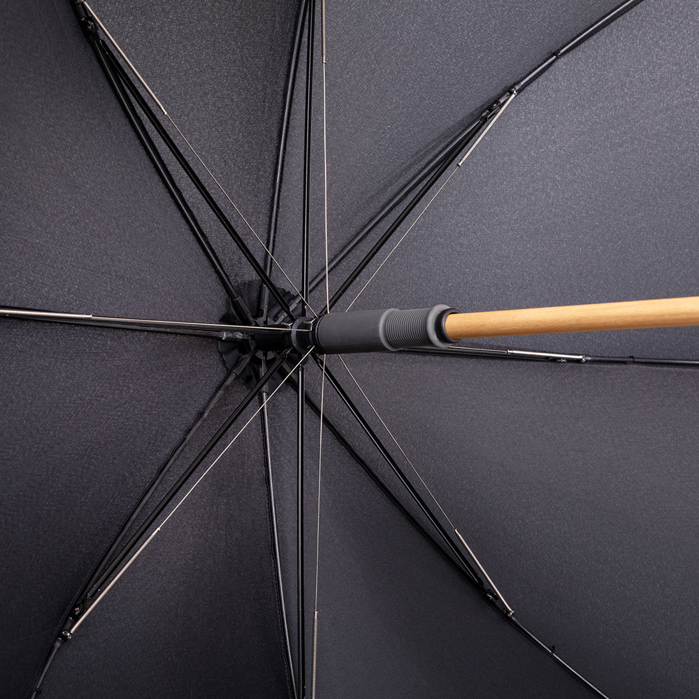 Dieser Regenschirm hat eine Bespannung aus 190T rPET Soft-Pongee und einen Durchmesser von ca. 105 cm. Mit einer geschlossenen Länge von ca. 88 cm lässt er sich dank der EASY OPEN Öffnungsmechanik schnell und einfach öffnen. Der Schirm verfügt über 8 stabile Segmente und 58,5 cm lange Fiberglasspeichen für zusätzliche Flexibilität. Der robuste 14 mm Holzschaft sorgt für Haltbarkeit, während der gebogene Holzgriff für eine angenehme Handhabung sorgt. Ausgestattet mit Metalltips und einer Holzspitze sowie einer Windproof-Funktion, ist der Schirm besonders widerstandsfähig gegen starken Wind.