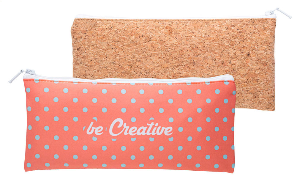 Individuelle Reißverschluss-Stiftetasche aus Polyester mit Rückseite aus natürlichem Kork. Der Preis ist inkl. Sublimationsdruck auf der Vorderseite. Mindestmenge: 50 Stk.