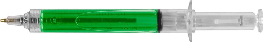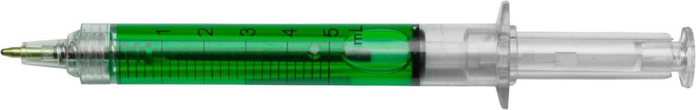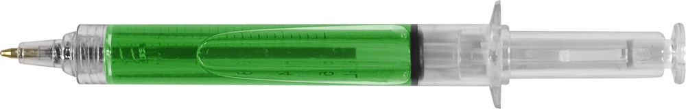 Kugelschreiber aus Kunststoff in Spritzenform, mit schwarzer Mine.