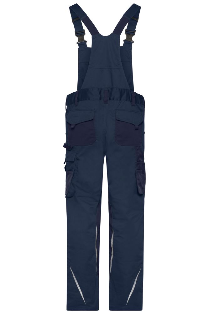 Robustes, strapazierfähiges, elastisches Mischgewebe aus recyceltem Polyester, BIO-Baumwolle und Elasthan Dehnbarer Bund mit Gürtelschlaufen Latz mit längenverstellbaren, elastischen Trägern, Reißverschlusstasche auf Rückseite Mit CORDURA® verstärkte Kniepolstertasche Reißfeste Dreifachnaht Schubtaschen, diverse Werkzeugtaschen 2 Taschen mit Reißverschluss Zollstocktasche, Stiftefächer, Handytasche Reflexelemente (ohne Schutzfunktion/keine PSA) an Vorder- und Rückseite Reißverschlüsse: YKK 1/2 Bundweite: 51 cm 1/2 Hüftweite: 54 cm Seitenlänge: 105 cm Work-Level: SOLID Stretch Große Größen lang CORDURA® Bio Baumwolle GRS Standard YKK - Reißverschluss