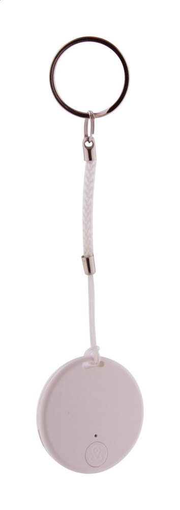 Drahtloser Schlüsselfinder mit Kameraverschluss, in einem runden Kunststoffgehäuse. Mit Schnur und Metallschlüsselring. Mit Knopfzellenbatterie. Funktioniert mit einer kostenlosen iOS / Android App.