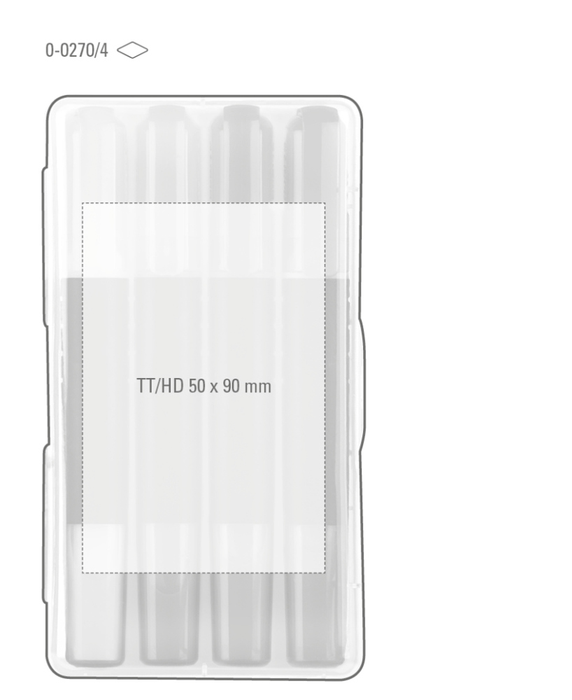 Flüssig-Textmarkerset bestehend aus 4 LIQEO HIGHLIGHTER PEN in einer klar transparenten Kunststoffverpackung. Standardfarben der Textmarker in gelb, grün, magenta und blau. Optional wählbare Textmarkerfarben: orange und violett.