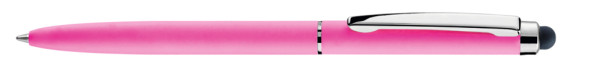 Metall-Drehkugelschreiber mit farbig mattem oder weiß glänzendem Gehäuse und silber glänzenden Beschlagteilen. Gummiertes Schaftende für die Touchscreensteuerung.