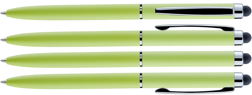 Metall-Drehkugelschreiber mit farbig mattem oder weiß glänzendem Gehäuse und silber glänzenden Beschlagteilen. Gummiertes Schaftende für die Touchscreensteuerung.