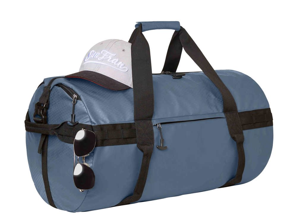 komfortable Sport-Reisetasche mit Rucksackfunktion; geräumiges Hauptfach mit 2-Wege-Reißverschluss und seitlichen Steckverschlüssen; seitliches Reißverschlussfach; Reißverschluss-Vortasche; umlaufendem Funktions- Schlaufenband; diverse Handgriffe; Tragegriffe und versteckte, gepolsterte und längenverstellbare Schultergurte