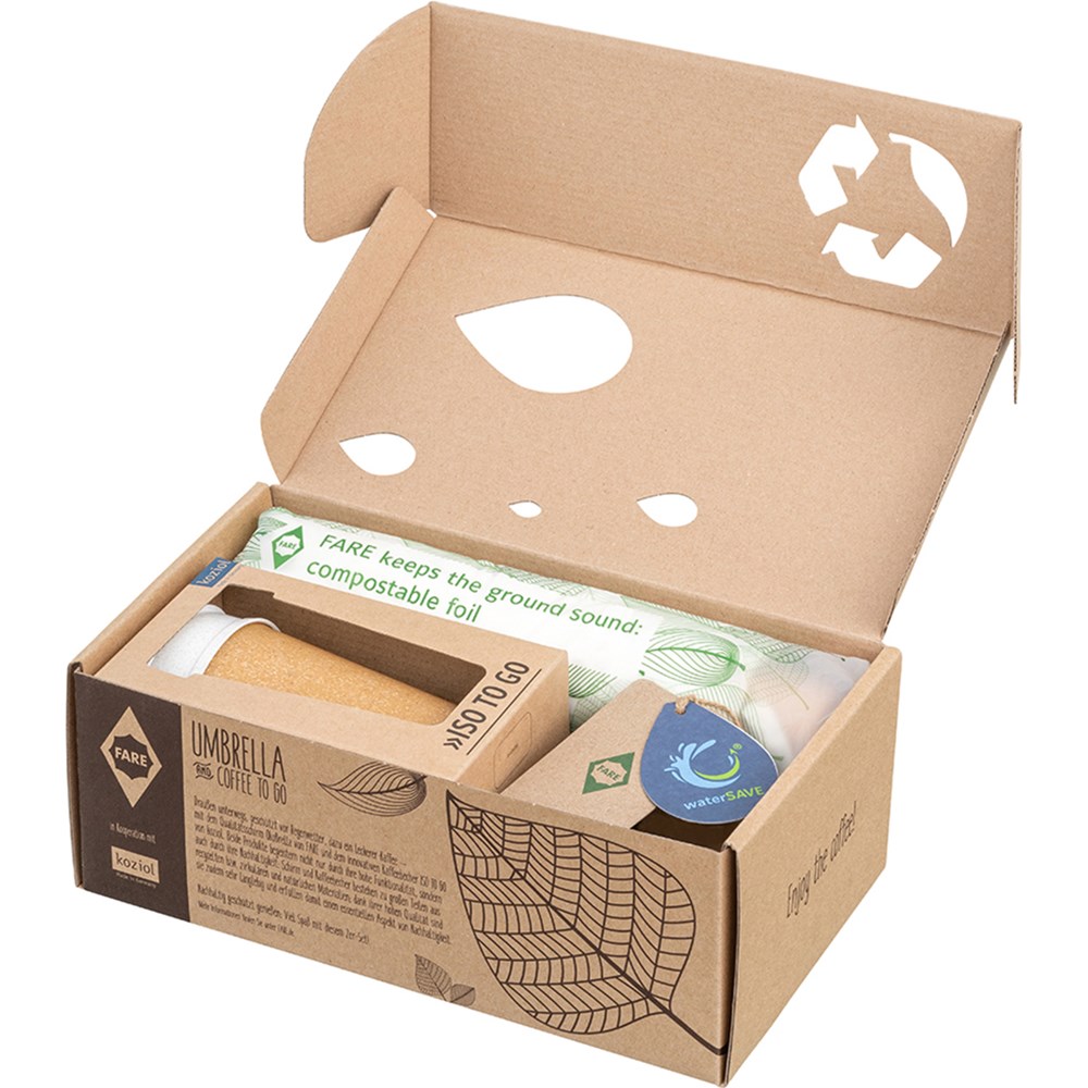 Nachhaltiges Set bestehend aus Taschenschirm und Isolierbecher Schirm: Nachhaltiger Handöffner-Taschenschirm mit wassersparend gefärbtem Polyester-Pongee waterSAVE® Bezugsmaterial aus recycelten Kunststoffen und hochwertigem Windproof-PLUS-System für eine maximale Gestell-Flexibilität bei stärkeren Windböen, Echtholzgriff mit Werbeanbringungsmöglichkeit, Becher: Doppelwandiger Thermobecher ISO TO GO von Koziol mit 400 ml Fassungsvermögen, Material lebensmittelecht und vollständig recycelbar, Lasche des innovativen Deckelverschlusses deckt Trinköffnung und Luftloch zuverlässig ab, spülmaschinengeeignet und bruchsicher, Verpackung: Lieferung in bedruckter Kartonage