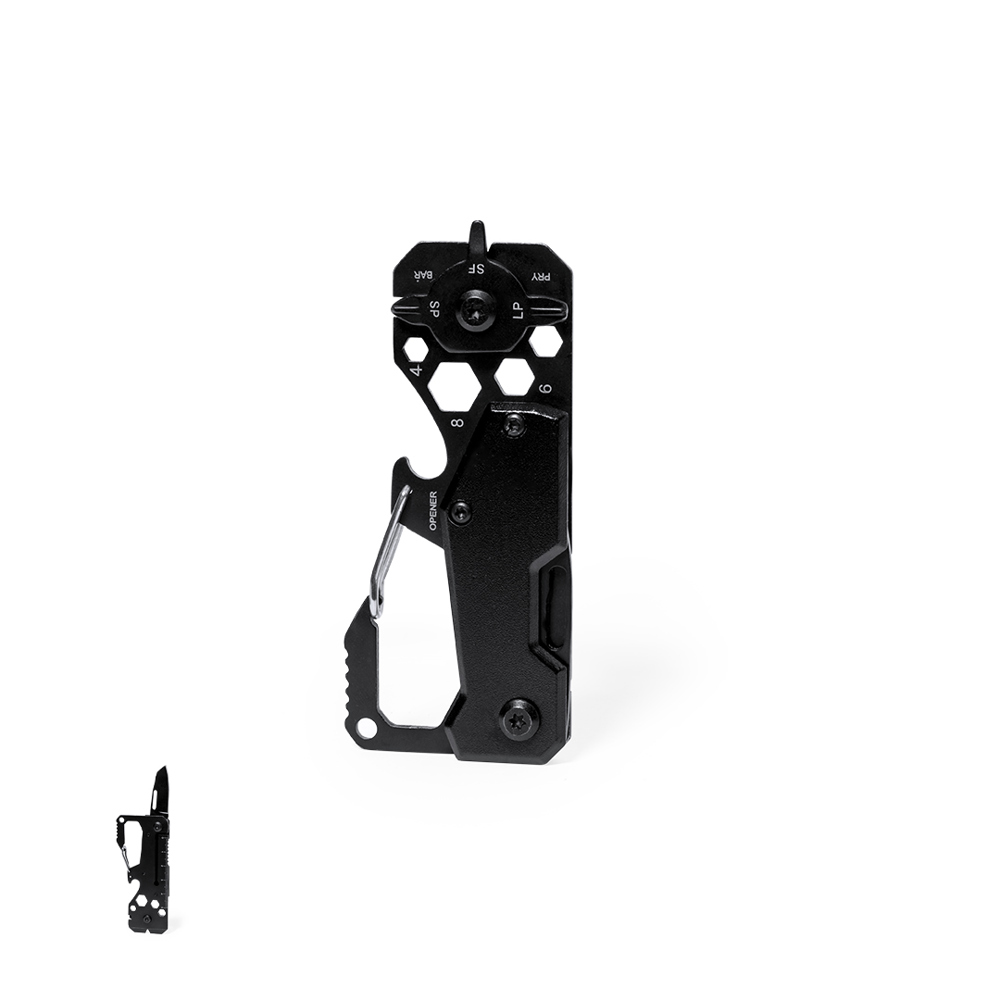 Hervorragendes Multitool aus Aluminium und Edelstahl mit schwarzer Oberfläche. Mit 13 verschiedenen Funktionen: Schraubenschlüssel für Sechskantmuttern in verschiedenen Größen, Karabiner, Dosenöffner, Lineal, Schaber, Messer, Flach- und Kreuzschlitzschraubendreher. Präsentiert in einer Kraft-Design-Box.