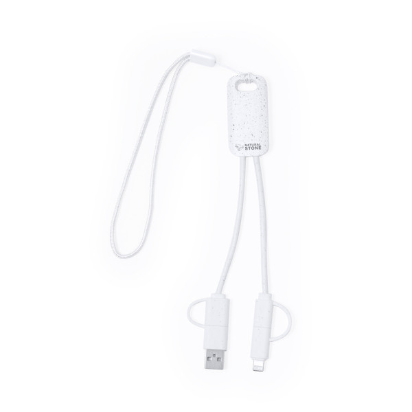 Ladekabel aus Naturstein-Extrakten in Kombination mit widerstandsfähigem ABS. Mit Typ C/USB-Eingangsanschlüssen und Typ C-, Lightning- und Micro USB-Ausgängen. 5V DC 2.4A. Präsentiert in einer individuellen Kraft-Design-Box.Hergestellt aus Natursteinextrakten, die dazu beitragen, die Verwendung von Kunststoffen zu reduzieren, und eine glatte und widerstandsfähige Oberfläche bieten.