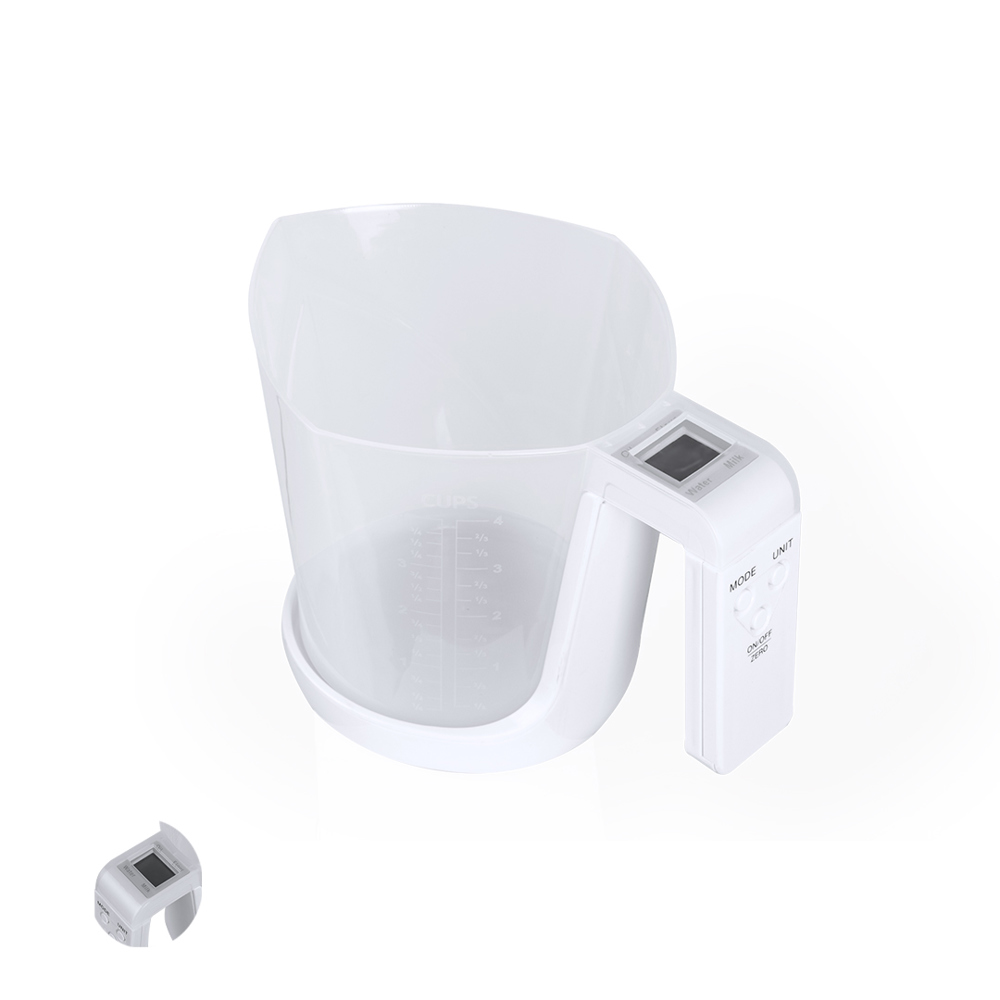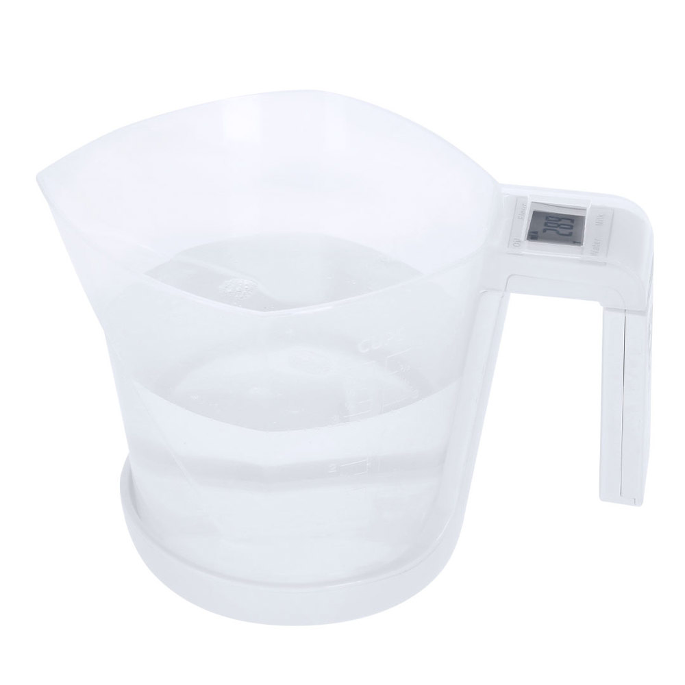 Waage mit integriertem Messbecher, hergestellt aus einer robusten PP/ABS-Kombination. LCD-Display mit Drucktastensteuerung und Tarafunktion, mit einer maximalen Kapazität von 5 kg Gewicht und geeignet für die Messung von Flüssigkeiten oder Feststoffen.Inklusive Messbecher mit 1L Fassungsvermögen, mit einer Vielzahl von Optionen und einem Auslaufstopp am Rand, um ein Verschütten zu verhindern:-1L, mit Seitenanzeige in 50-ml-Abschnitten; -32 oz, mit seitlicher Anzeige in 2 oz-Schritten -Schnelles Messen des Tassenvolumens,Stromversorgung durch Knopfzellenbatterie (im Lieferumfang enthalten), einzeln verpackt.